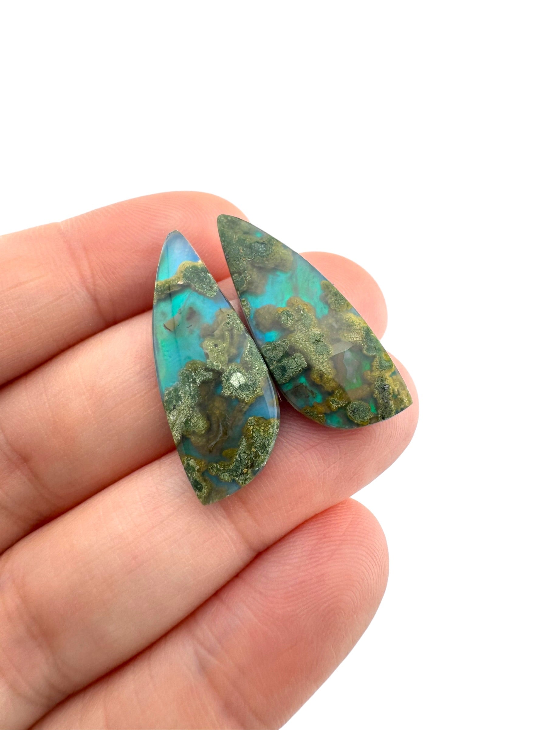 Each cabochon has its own pattern, and pairs are made by hand and cut to complement each other.