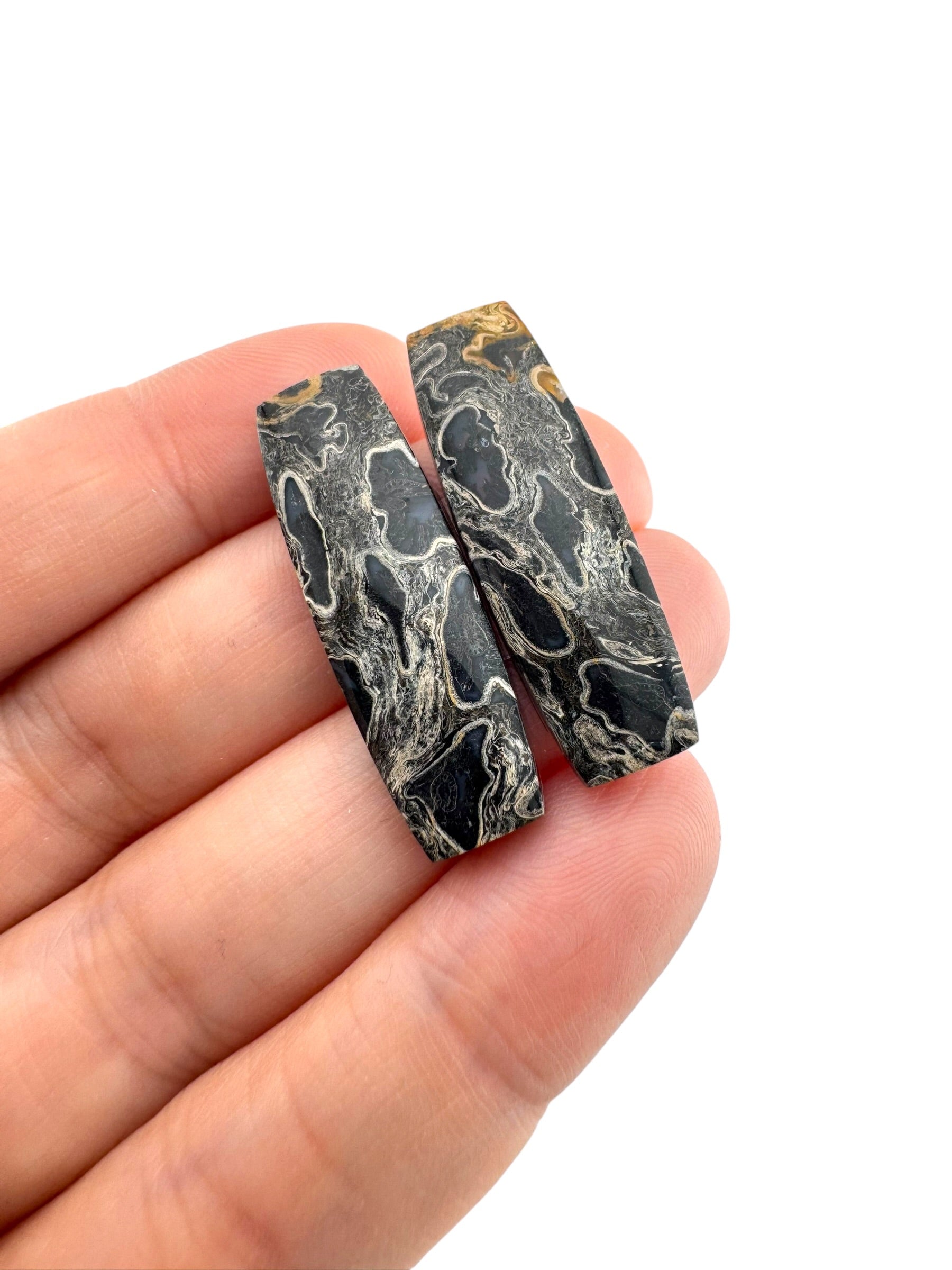 Each cabochon has its own pattern, and pairs are made by hand and cut to complement each other.